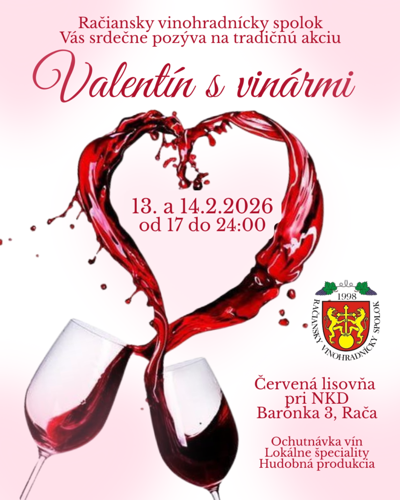 - Valentín s vinármi 2026 – pripravujemePiatok 13. februára 2026 od 17:00 do 24:00 hod.Sobota 14. februára 2026 od 17:00 do 24:00 hod. Červená lisovňa Nemeckého kultúrneho domu ul. Barónka č. 3 v Rači. Tešíme sa… Čítať viac: Valentín s vinármi 2026 – pripravujeme