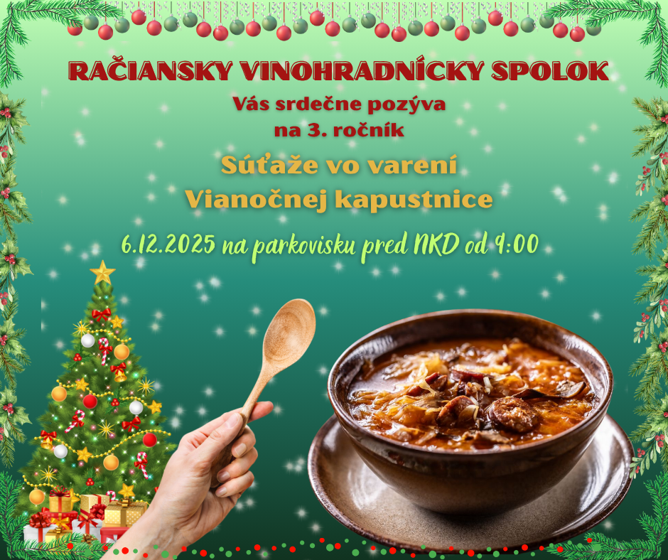 - Súťaž vo varení vianočnej kapustnice 2025Pravidlá a prihlásenie sa do súťaže 3. Ročník súťaže vo varení vianočnej kapustnice Organizátor: Račiansky vinohradnícky spolok Termín konania: 6.12.2025 Miesto konania: parkovisko pred NKD Čas konania: … Čítať viac: Súťaž vo varení vianočnej kapustnice 2025