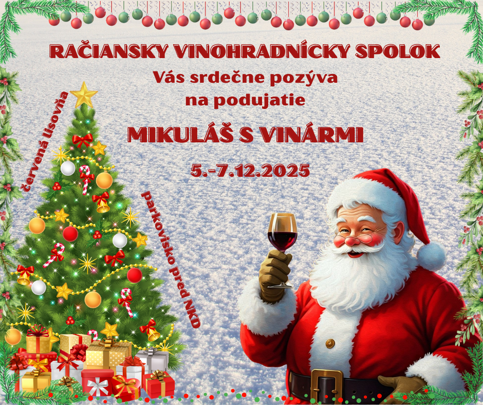 - Mikuláš s vinármi 2025🎄🎅🍷Milí Račania, priatelia, naši podporovatelia, známi a neznámi!Račiansky vinohradnícky spolok vás srdečne pozýva na „Mikuláša s vinármi“, ako súčasť Račianskych vianočných trhov (5. – 7. decembra 2025). Počas všetkých troch… Čítať viac: Mikuláš s vinármi 2025